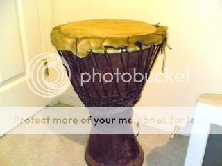 This is the drum that I picked up when I was on vacation in mexico. It was made from a single cedar log by a guy named Diego. It has a nice sound but you can see that either the base was not set right or the loops on the flesh ring were not done evenly.