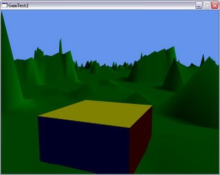 This stuff is really nice. I’m actually a bit addicted to the whole thing. I finally got some shader issues sorted out. I have a few very basic shaders right now, one that renders color coded normals for debugging purposes and one that does a single directional light and diffuse shading. I picked up a good shader book and a new 20” LCD yesterday when I was hanging out with Mike. Here’s a spinning cube inside a procedural landscape.